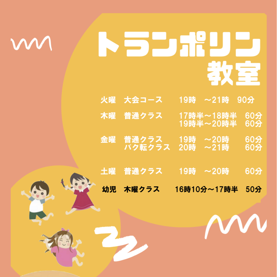 | 19:00-20:00 | バク転教室 | トランポリン教室(競技) | 一般 (自由・遊び) | トランポリン教室(19:30-) アクロバット教室 (19:30-) | トランポリン教室(19:00-) バク転教室 (20:00-21:00) | ||